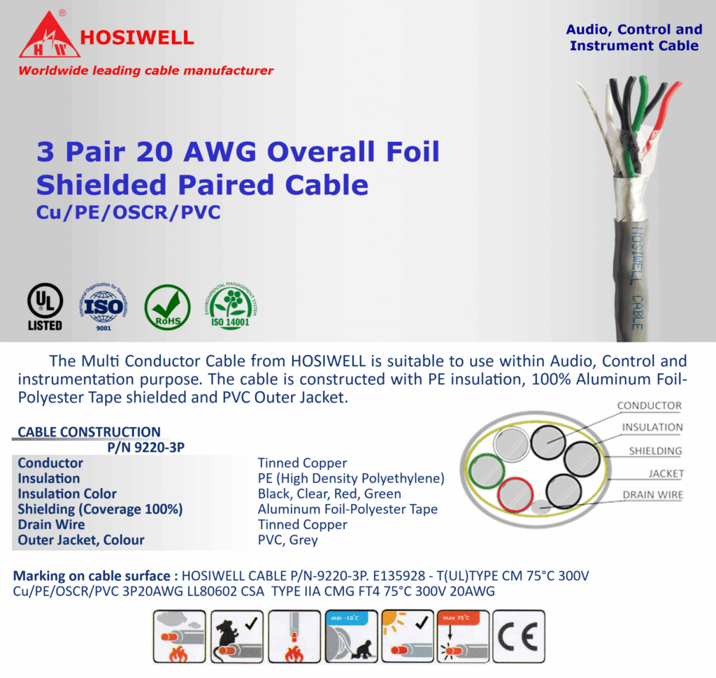 Marking on cable surface: HOSIWELL CABLE P/N-9220-3P. E135928 – T(UL)TYPE CM 75°C 300V Cu/PE/OSCR/PVC 3P 20AWG LL80602 CSA TYPE IIA CMG FT4 75°C 300V 20AWG