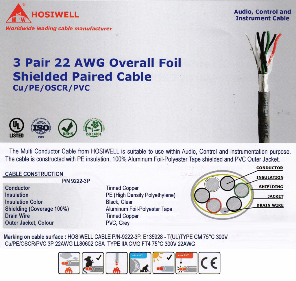Dây cáp tín hiệu điều khiển Hosiwell 9222-3P được sản xuất tại Thái Lan, Sử dụng Ruột dẫn: Đồng ủ mềm mạ thiếc CLASS 5 Tăng độ mềm dẻo, dễ thi công, Chống oxy hóa, nâng cao tuổi thọ dây dẫn. Số lõi: