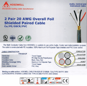 Cáp tín hiệu Hosiwell (9220-2P) – Cáp vặn xoắn chống nhiễu Tcu/PE/OSCR/PVC 2P x 20 AWG – 300/500V, 305m/Drum, Grey | Chính Hãng – Giá Tốt Nhất