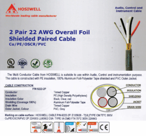 Cáp tín hiệu Hosiwell (9222-2P) – Cáp vặn xoắn chống nhiễu Cu/PE/OSCR/PVC 2P x 22 AWG – 300V/500V, 305m/Drum, Grey | Chính Hãng – Giá Tốt Nhất